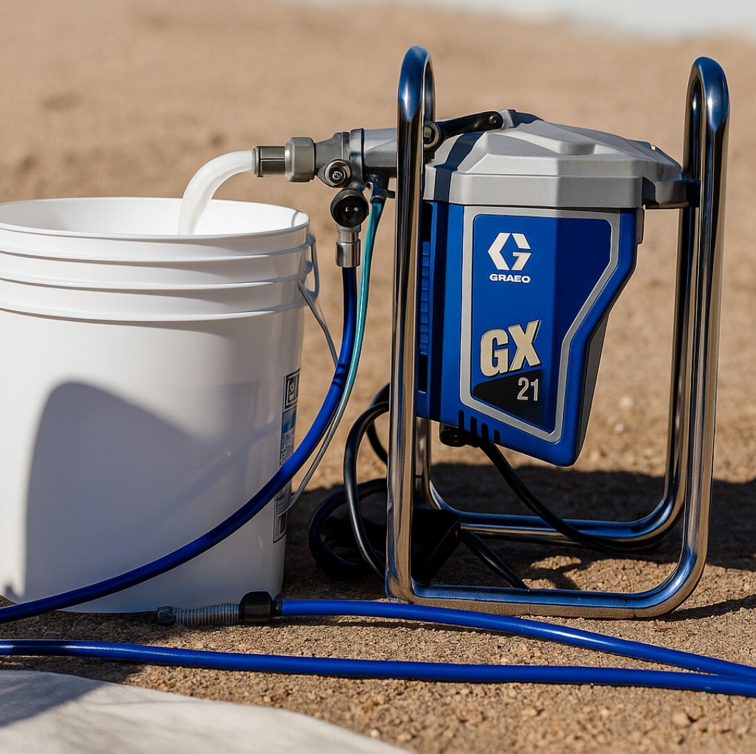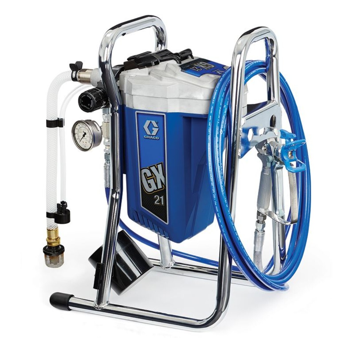 Agregat malarski Graco GX 21 służy do malowania natryskowego, idealnie nadaje się do prac przy renowacji i wykańczaniu obiektów mieszkalnych, pracach konserwacyjnych, a także malowaniu ścian i sufitów. Jest to poręczne, łatwe w przenoszeniu i użytkowaniu urządzenie dla profesjonalistów i małych firm, umożliwiające szybkie i wydajne malowanie bezpośrednio z pojemnika na farbę.